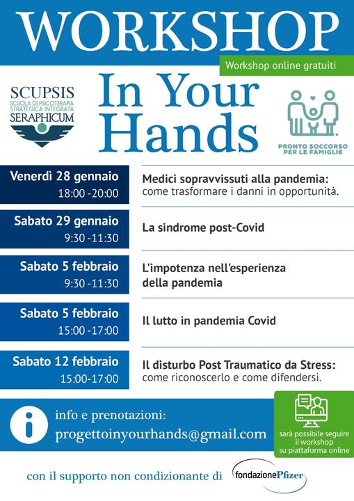 In programma una serie di workshop molto interessanti, all’interno del progetto “In Your Hands”, nato dalla collaborazione tra Associazione Pronto Soccorso per le Famiglie e SCUPSIS (Scuola di Specializzazione in Psicoterapia Strategica Integrata), con il supporto di Fondazione Pfizer.
